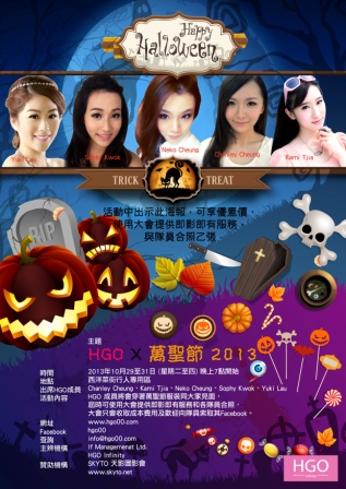 HGO 成員將會穿著萬聖節服裝同大家見面主題 HGO X 萬聖節 2013時間 2013年10月29至31日(星期二至四)晚上7點開始地點 西洋菜街行人專用區出席HGO成員 Chanley Cheung, Kami Tjia, Neko Cheung, Sophy Kwok, Yuki Lau歡迎各位支持她們的朋友前來支持佢地HGO上